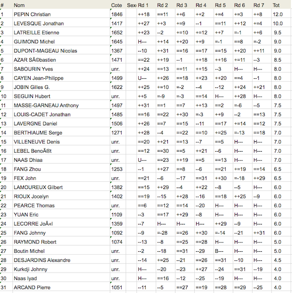 31 joueurs, un record au CEH, ont participé à ce tournoi blitz. Christian Pépin a remporté haut la main la compétition avec 2 points d’avance sur l’excellent Jonathan Lévesque.