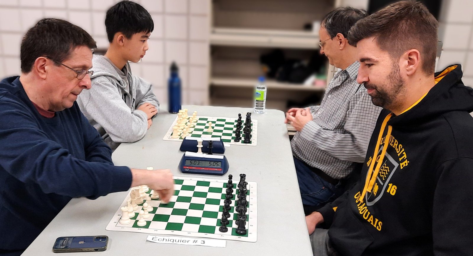 L’atmosphère est toujours à la fête lors des soirées de blitz même si notre champion défendant de blitz, Sébastien Azar, était absent. Cela dit, les gens qui me connaissent savent que les blitz ne sont pas ma tasse de thé. Pourtant, j’ai eu une fantastique soirée alors que j’ai terminé en première place exæquo avec mon ami, le puissant expert et favori du tournoi, Étienne Latreille. Francis Thompson, qui m’a vaincu dans le tournoi, a terminé en 3e position alors que Christian Pépin et Anthony Massé-Garneau ont terminé tout juste derrière les meneurs.