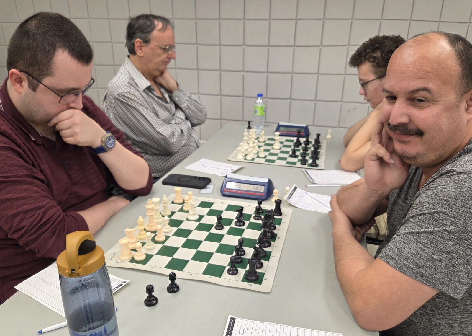 Anthony Massé-Garneau se hisse de 3 échelons au 4ème rang grâce à sa victoire contre Abdelaziz Mahdjoubi. Les autres joueurs qui montent au classement sont: Achille Collin (2 échelons) après son gain contre Hubert Séguin, Benjamin Trahan (4 niveaux) qui a fait trébucher Robert Blais et notre nouvelle recrue Phelan Hougan qui l’a emporté contre le vétéran Alain Thibeault (2 rangs). Les deux seuls joueurs invaincus, qui ont joué 4 parties, sont l’ex-champion Sébastien Azar (3,5 pts) et le jeune Maxime Desroches (3 pts).