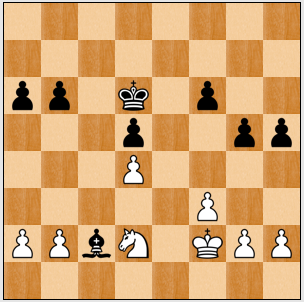 Daniel Raymond – Joël Lecorre : Une partie qui démontre toute la difficulté des finales. Voyez cette position atteinte après 25 coups. Aux dires de mes engins informatiques en tout cas, elle est complètement égale. Mais qu’en pensez-vous ? Et quels devraient être les plans des deux joueurs ? Le Fou est-il supérieur au Cavalier ?