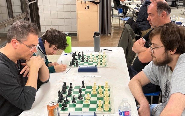 Bélanger vs Pontier-Valois : j’ai été agréablement surpris de constater qu’il y avait un autre joueur que moi qui jouait l’ouverture de Vienne au club (1.e4 e5 2.Cc3 Cf6 3.f4), Hadrien Pontier-Valois! En passant, l’ouverture viennoise est très peu jouée parmi les plus forts joueurs dans le monde. En effet, la raison est que les noirs ont un coup théorique qui leur permet d’égaliser seulement au 3e coup : 1.e4 e5 2.Cc3 Cf6 3.f4 d5! J’adopte un ordre de coups un peu différent avec les blancs pour me permettre d’empêcher ce coup égalisateur. Si ça t’intéresse, Hadrien, je pourrai en parler avec toi.